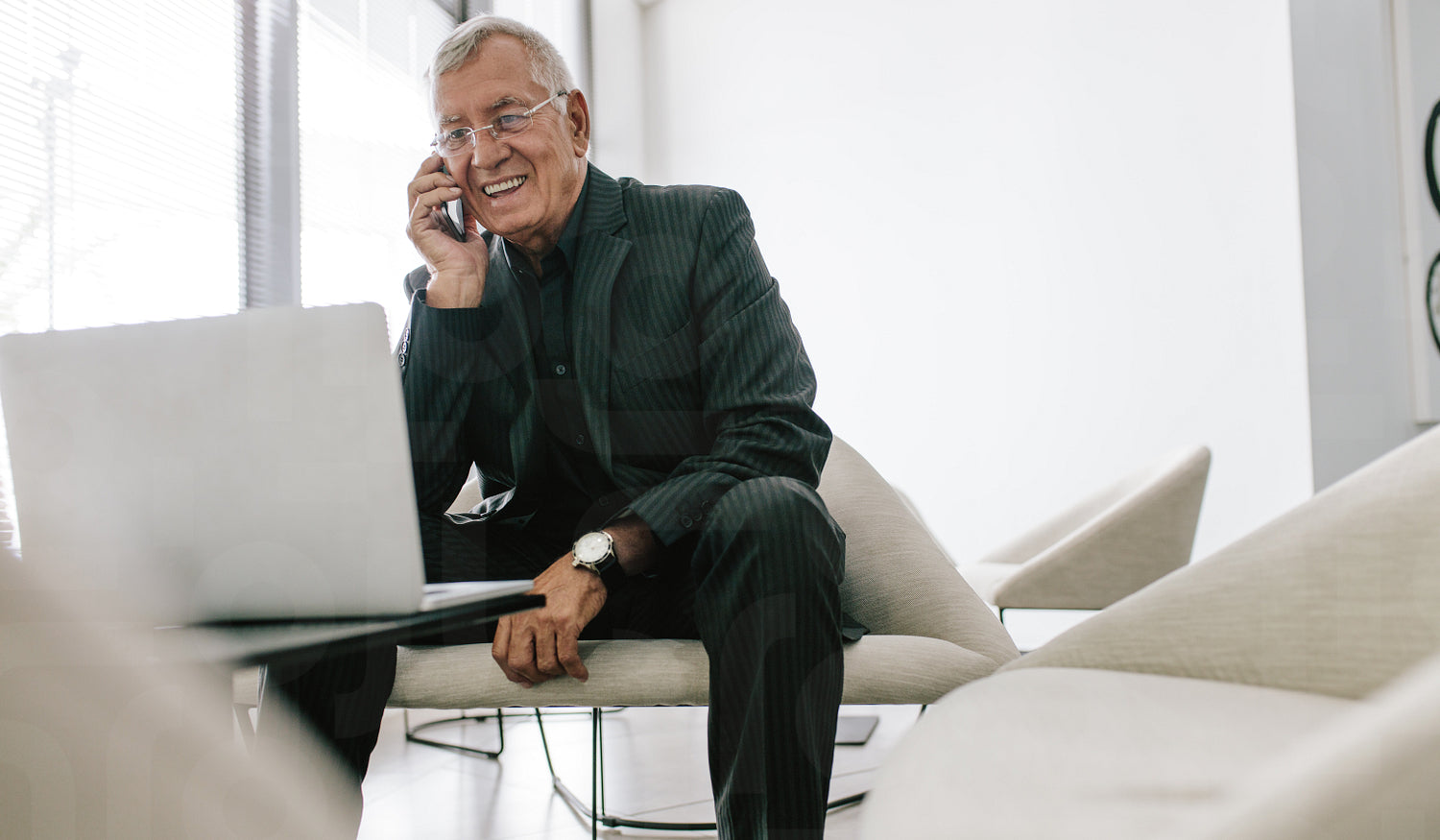 Mature businessman sitting in office lobby with a laptop using mobile phone. Senior male executive working in lobby.