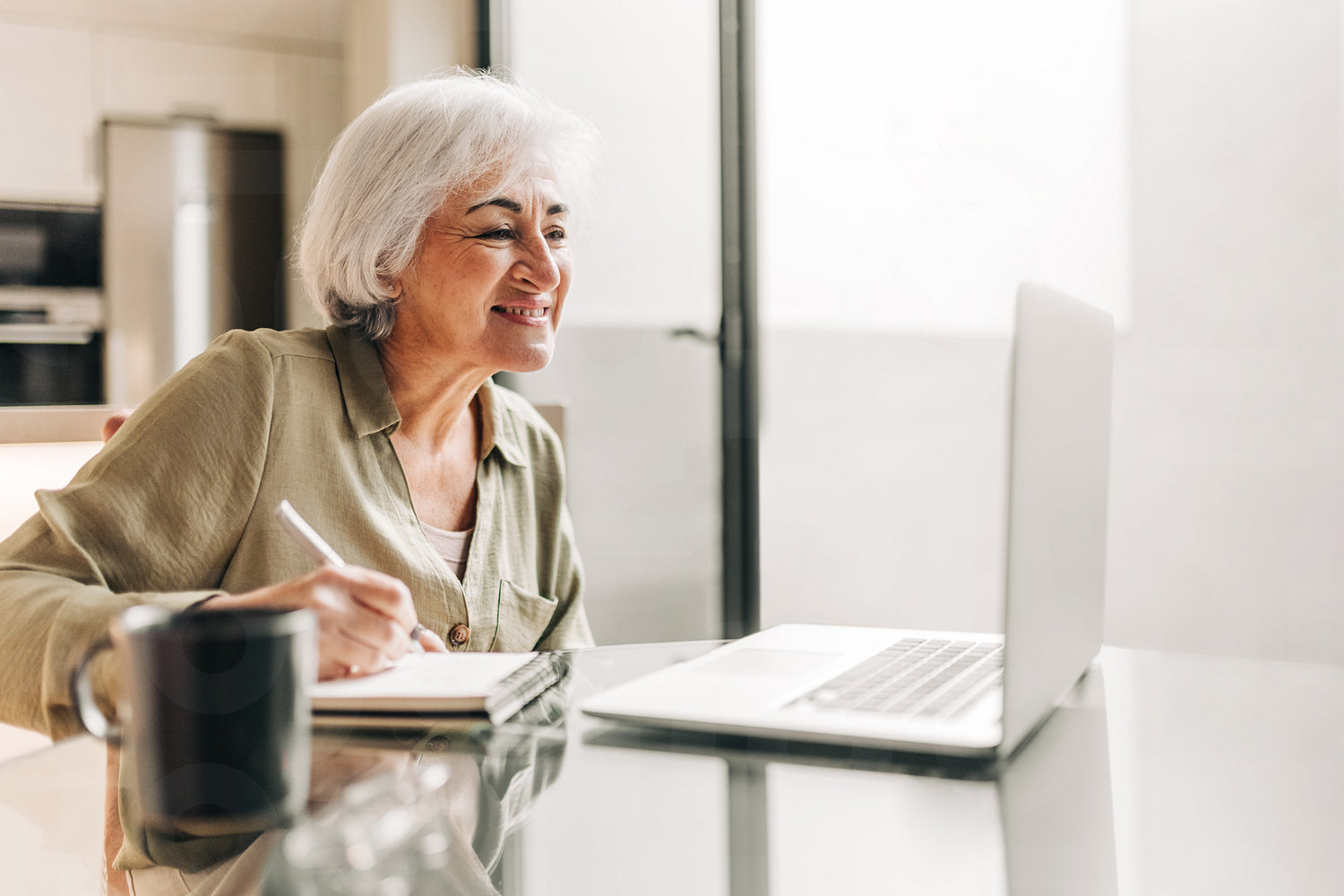 Mature businesswoman making notes while attending a video conference in her home office. Senior businesswoman smiling happily during a meeting with her business partners.