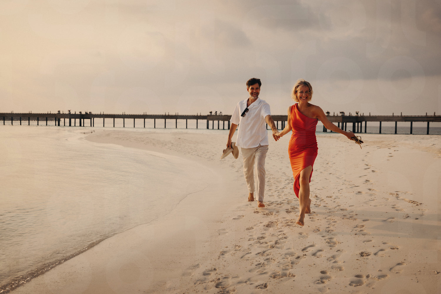 Mature couple holding hands and walking along the beach at sunset, enjoying a romantic moment on an island.