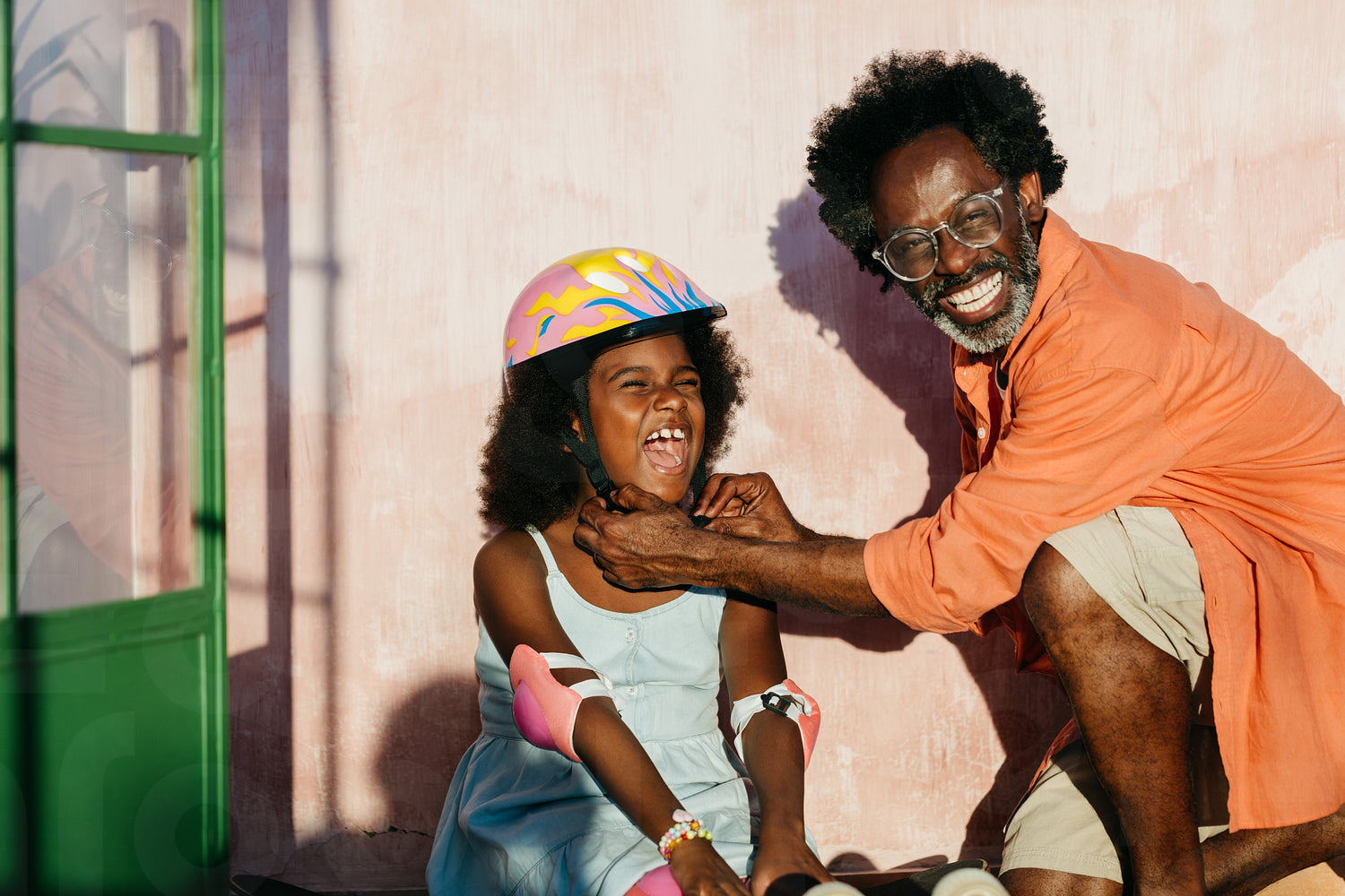 Mature father putting a helmet on his daughter for safety as they prepare for a scootering activity. Dad getting his daughter ready to ride on the wheels, creating a moment of joy and outdoor fun.