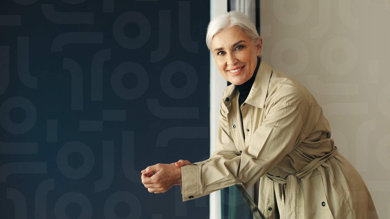 Senior female professional smiles warmly at the camera while standing on the balcony inside her office, projecting competence and confidence in her business acumen.