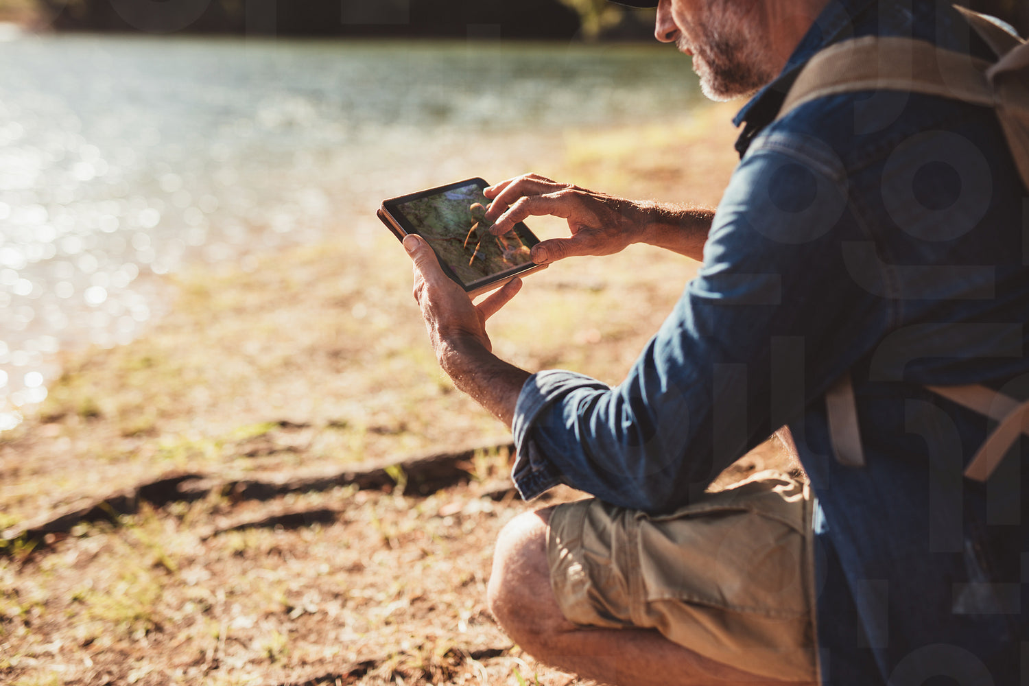 Close up portrait of senior male hiker with backpack using digital tab and looking for location during hike in nature. Mature man on hike using digital tablet for navigation.