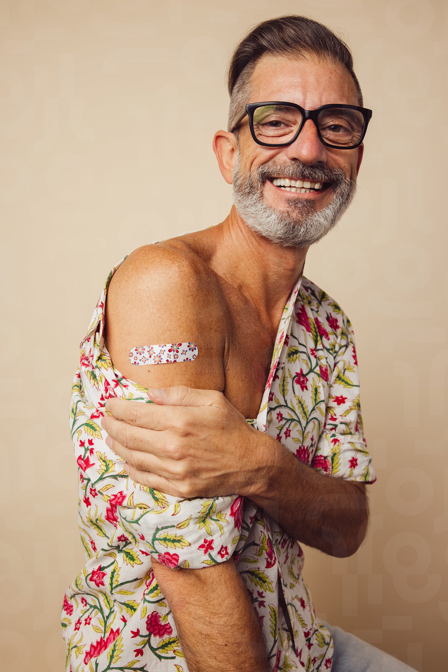 Portrait of mature man smiling after getting vaccine. Mature man showing his arm with bandage after receiving corona virus vaccination.