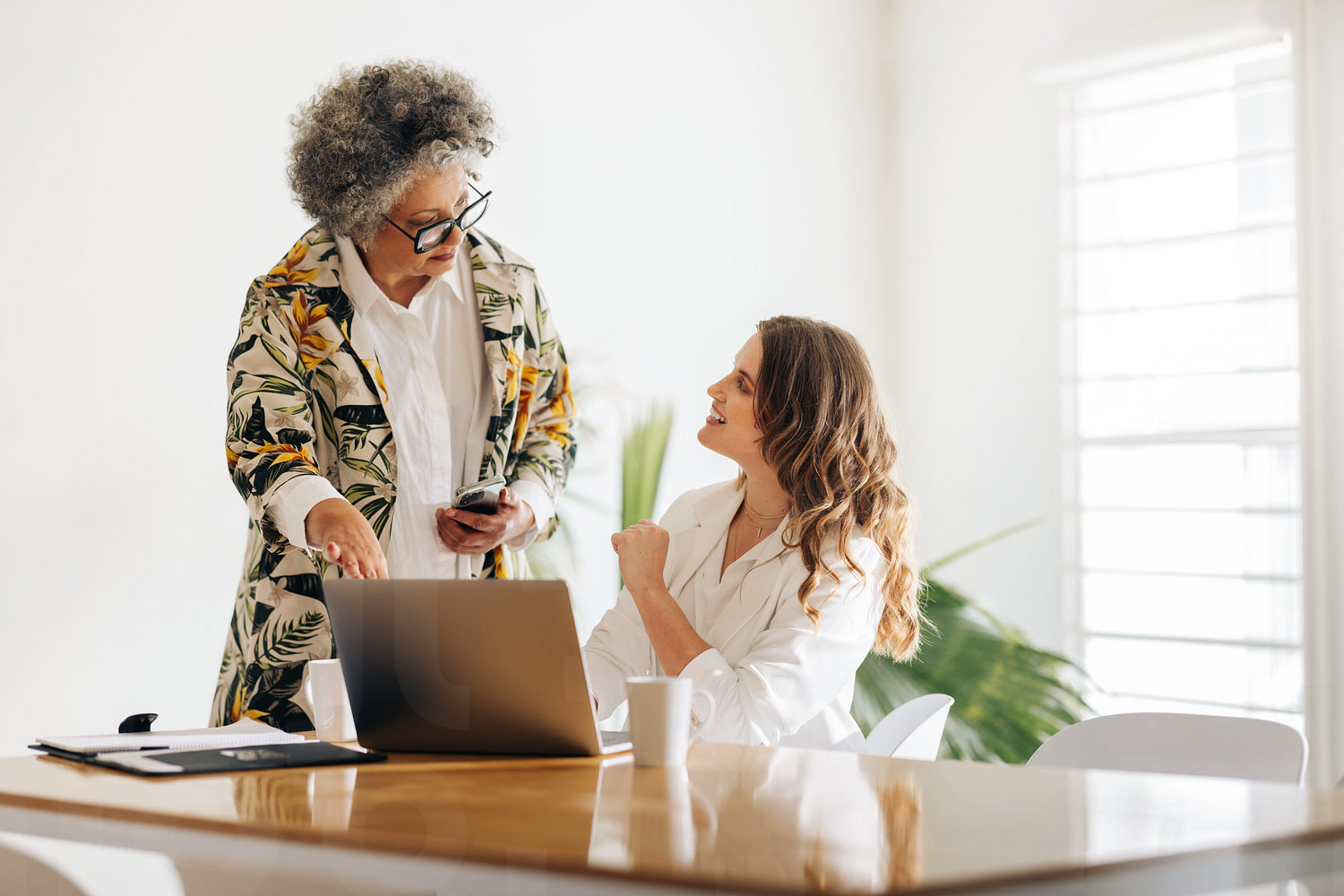 Mature manager having a discussion with her colleague in a meeting room. Two creative businesswomen collaborating on a new task in a woman-owned startup.