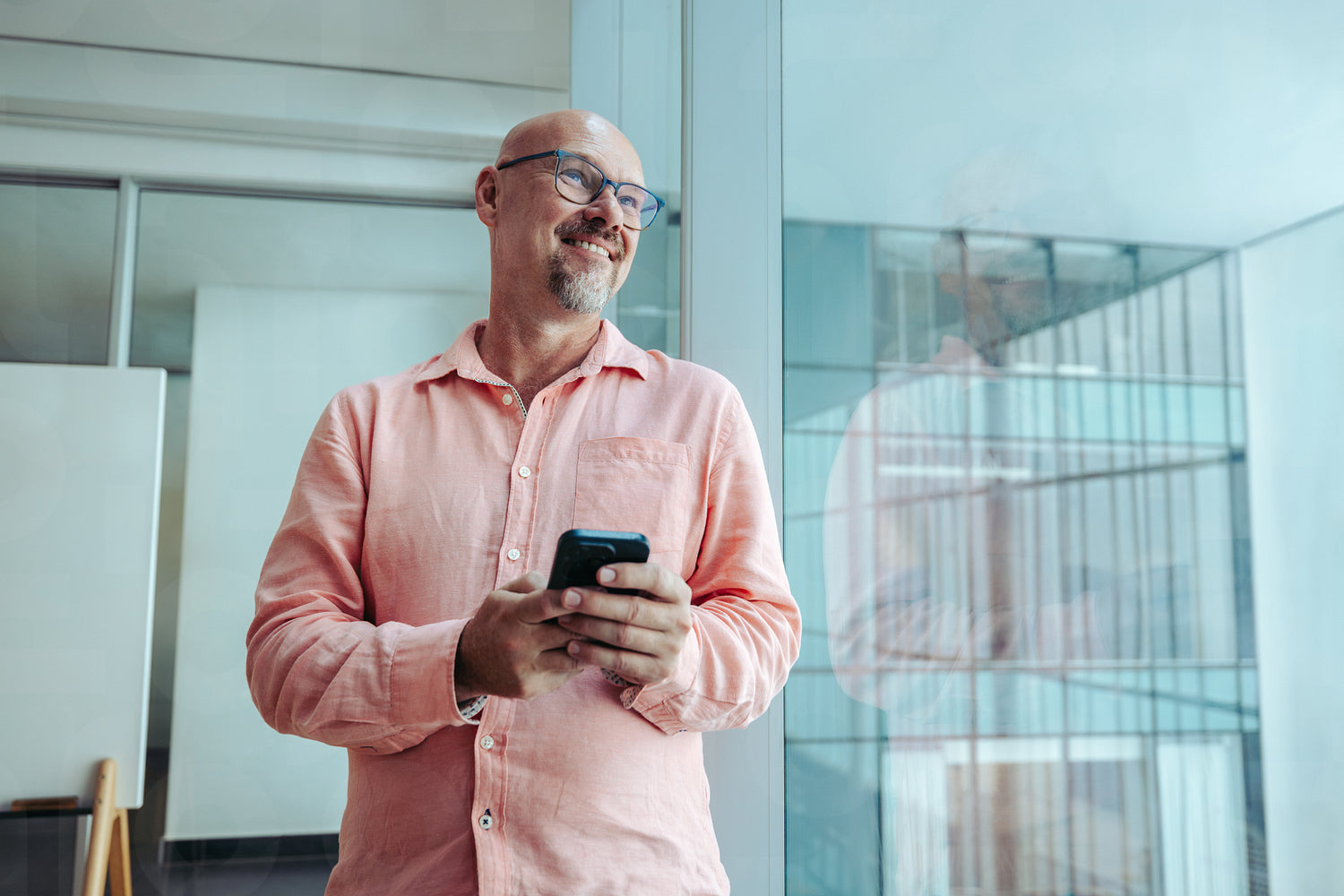 A mature professional entrepreneur stands confidently in a modern office setting, holding a smartphone. Happy and relaxed, he embodies a positive business mindset and embraces technology.