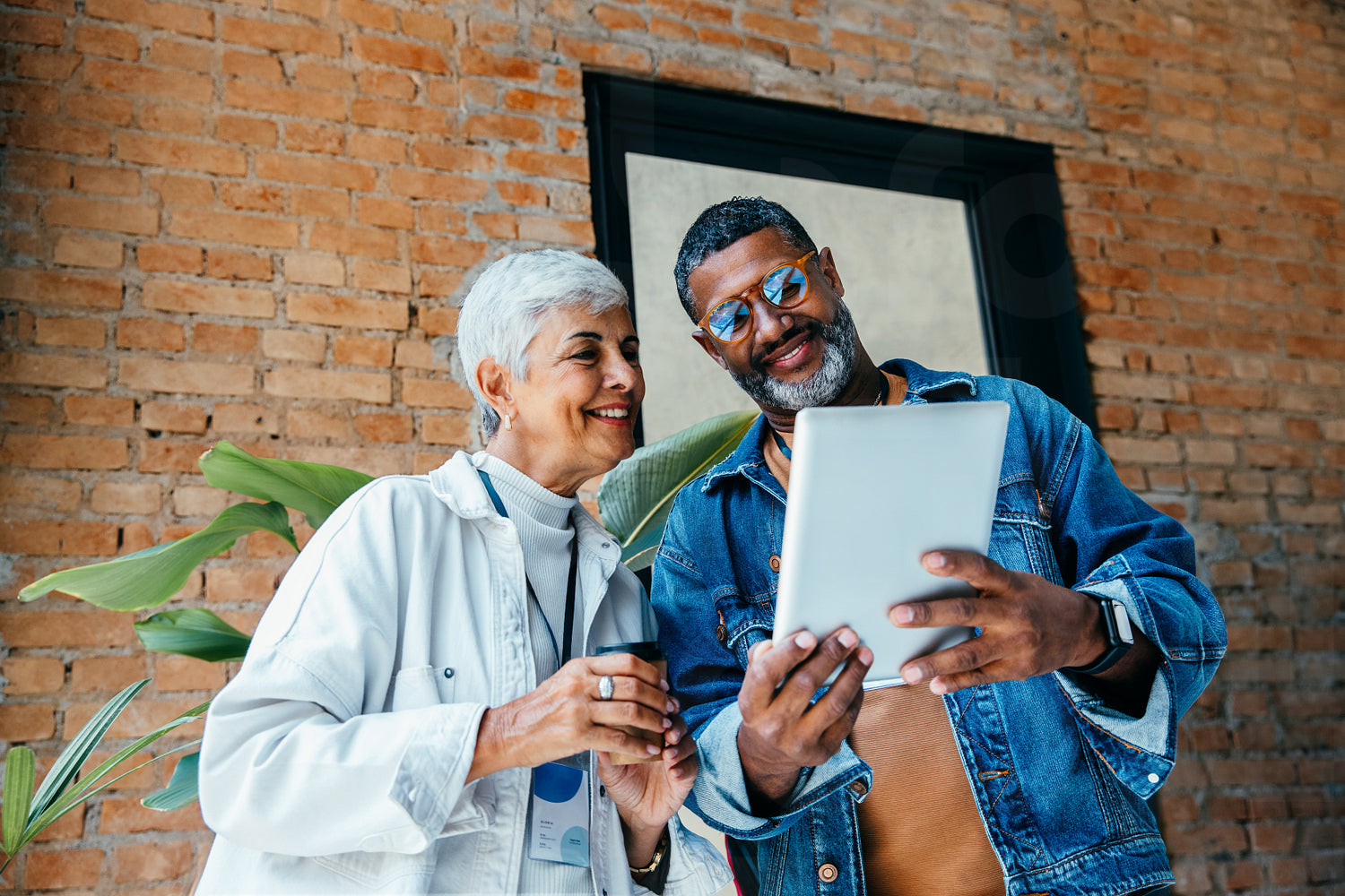 Mature professionals discussing work on a tablet in an office with natural light and vibrant greenery