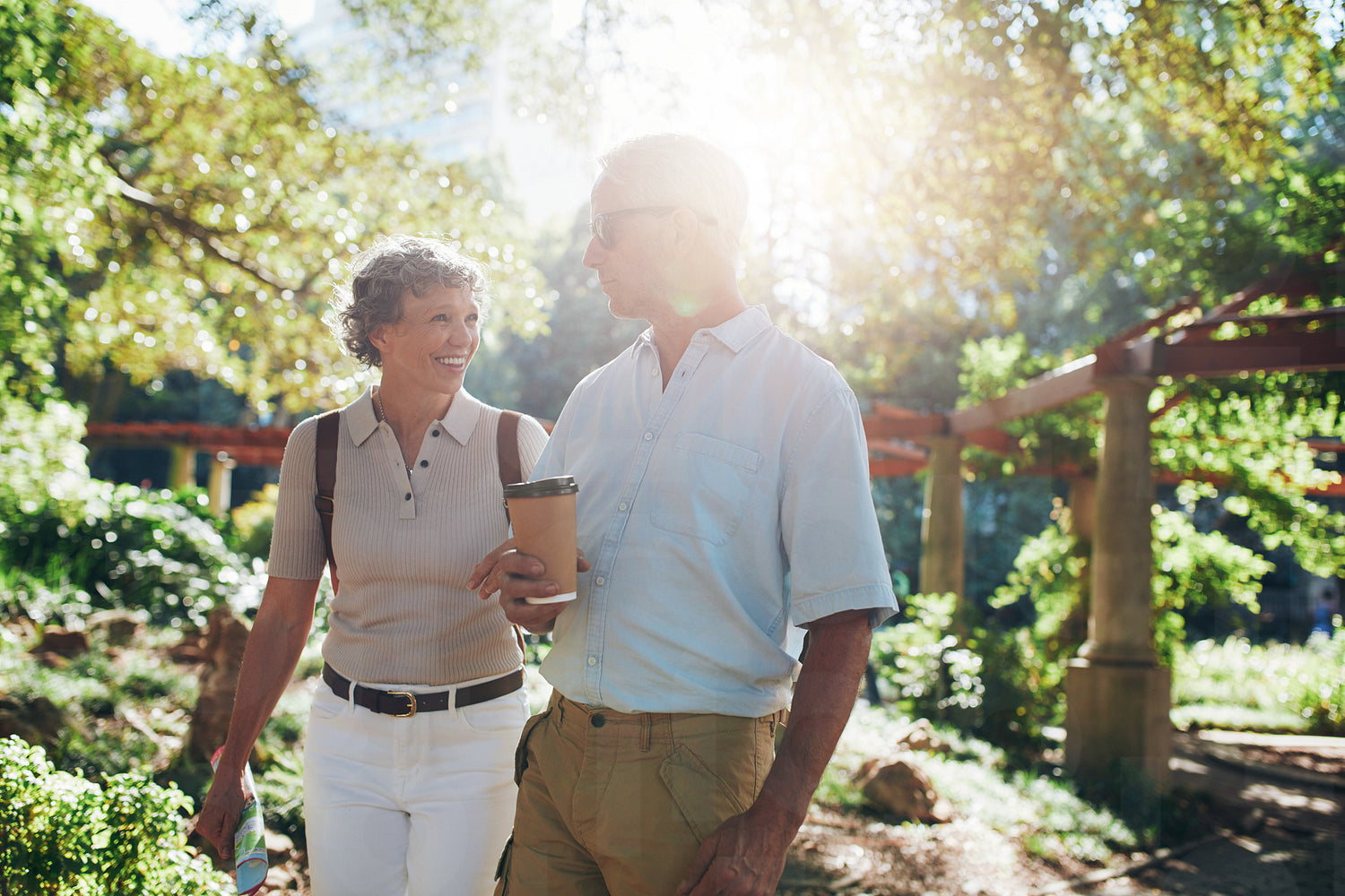 Portrait of loving senior couple walking through a park. Mature tourist walking in a city park on a sunny day.