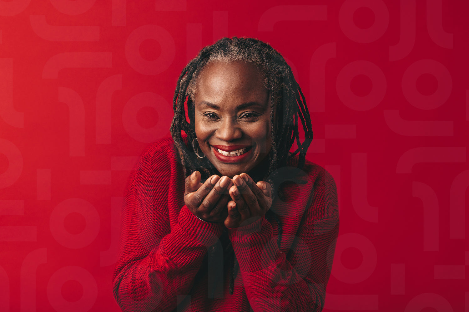 Mature woman smiling and blowing air confetti while standing against a red background. Happy middle-aged woman with dreadlocks having fun in a studio.
