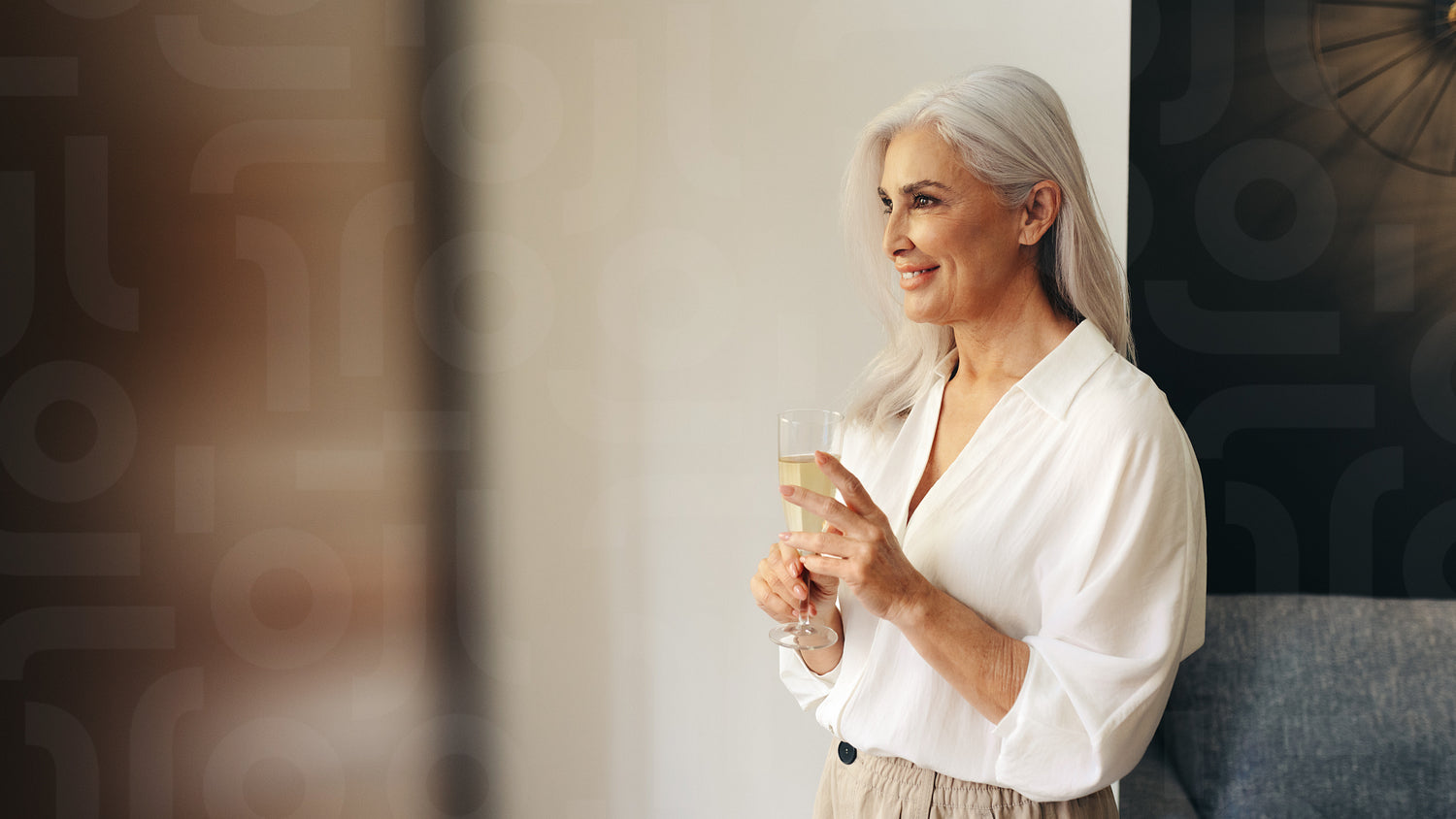 Mature woman enjoying a glass of wine as she celebrates her retirement