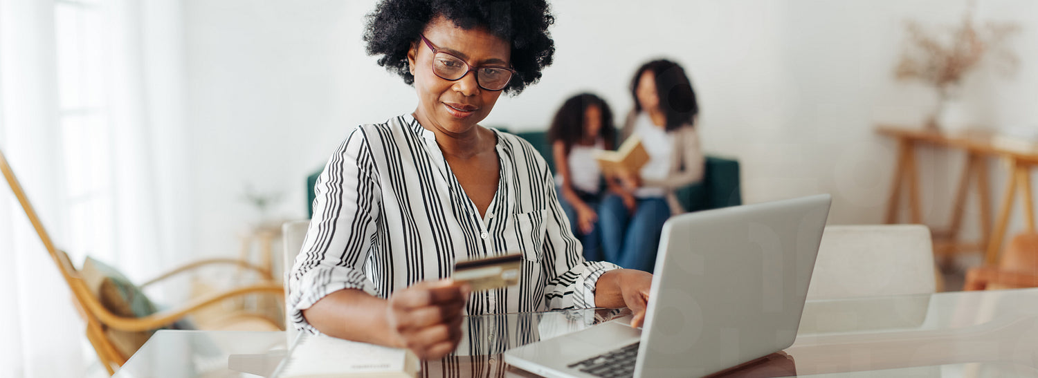 Mature woman doing online payment using credit card at home with family in background. Woman looking at credit card while doing payment on laptop at home.