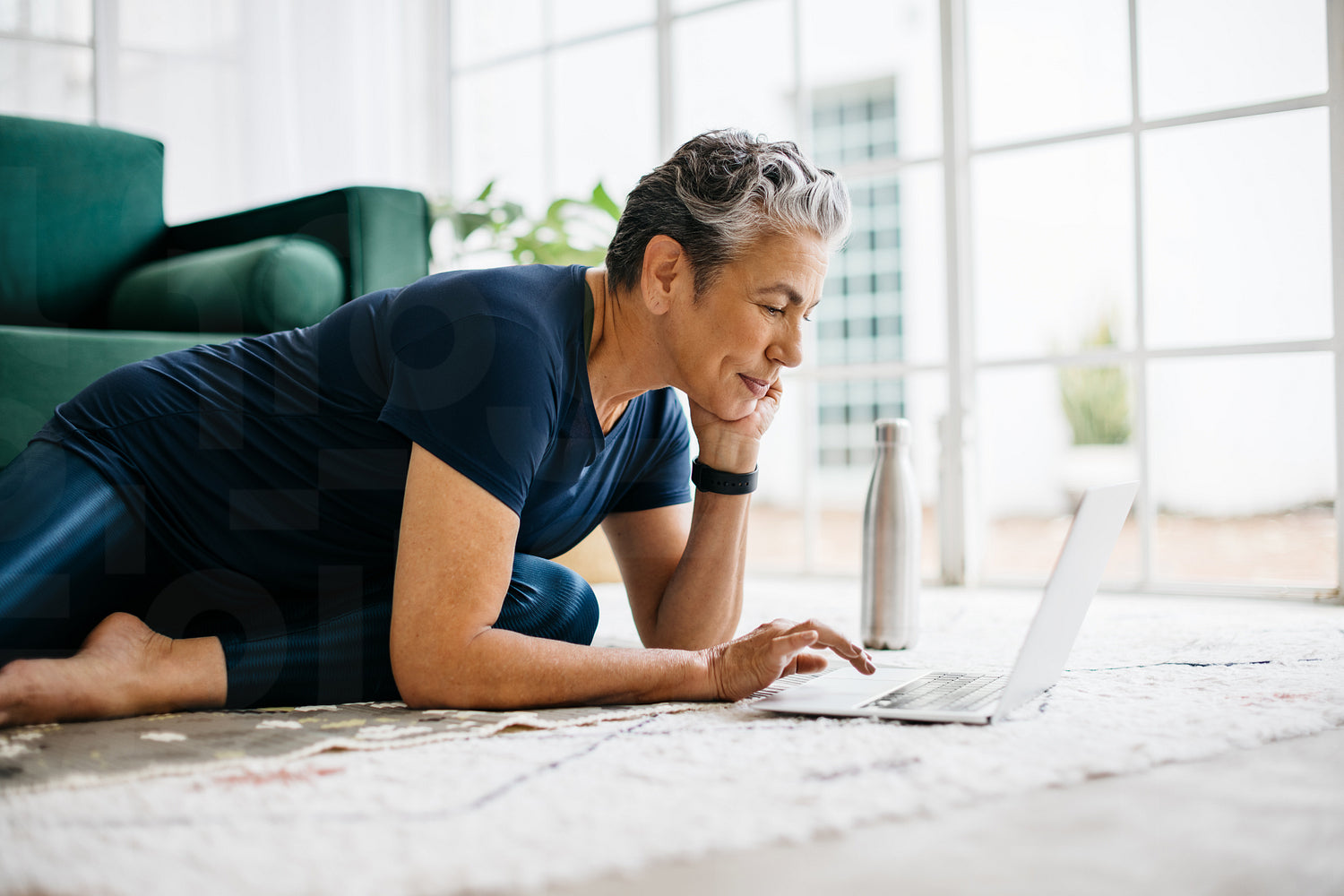 Mature woman using a laptop in fitness clothing, searching for an online workout tutorial. Senior woman sitting on the floor at home, ready to start her fitness routine for a better physical and mental wellness.