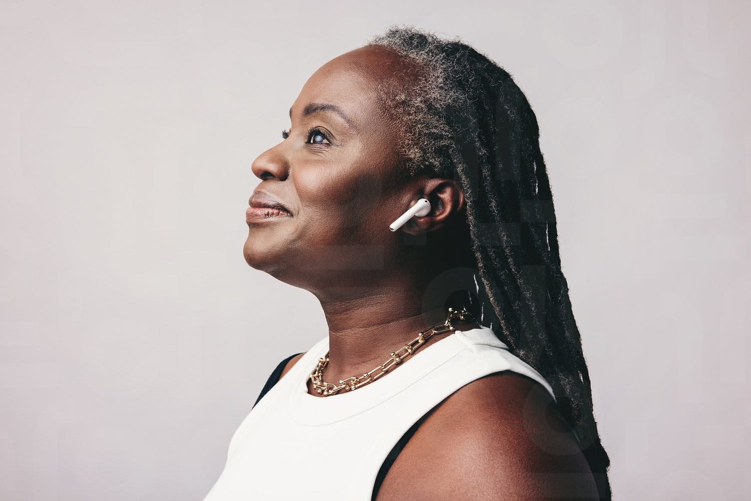 Mature woman with dreadlocks listening to some music on bluetooth earbuds. Fashionable middle-aged woman enjoying her favourite playlist while standing against a studio background.