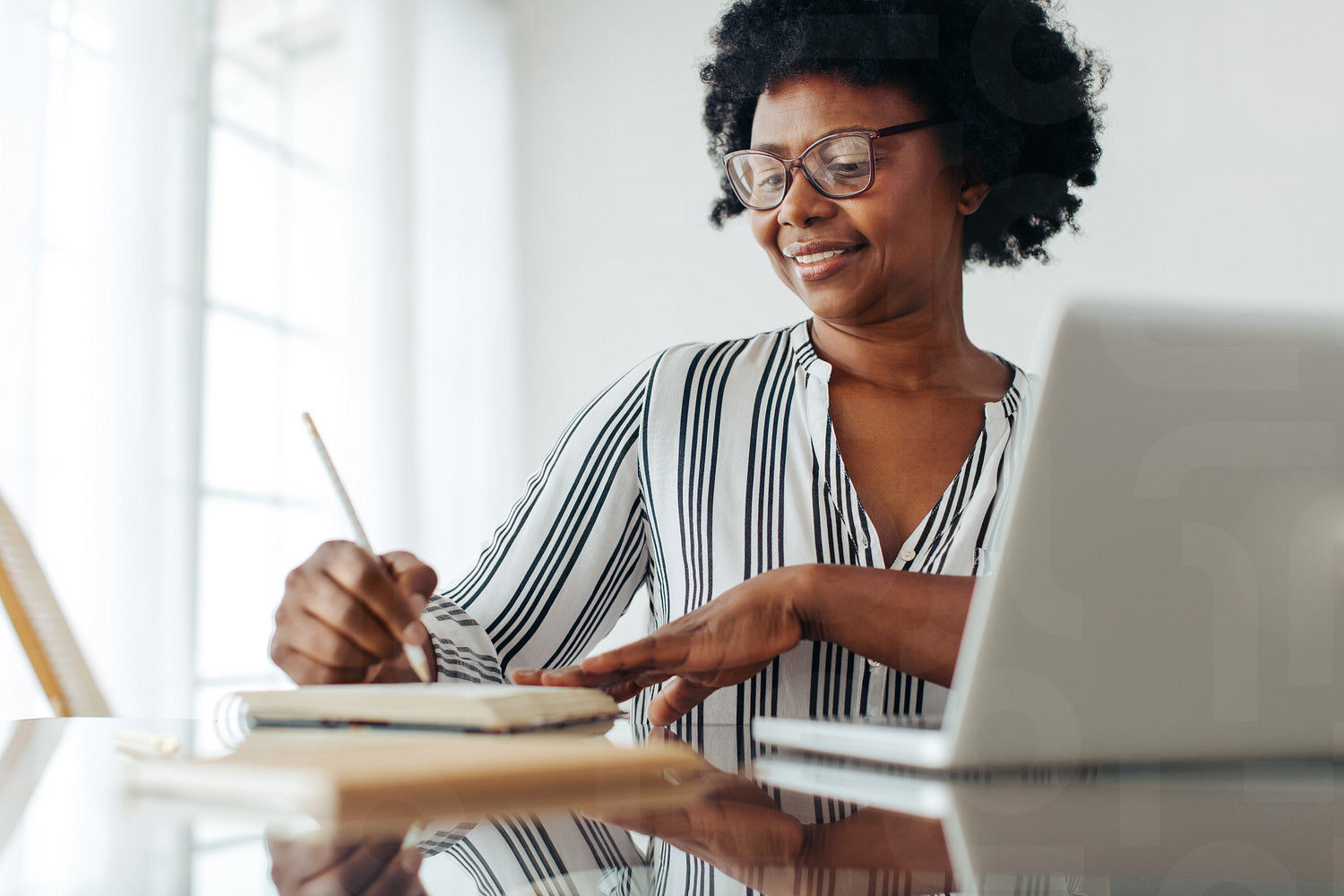 Happy woman sitting at desk at home and writing in her diary. Happy female taking notes in book while working from home.