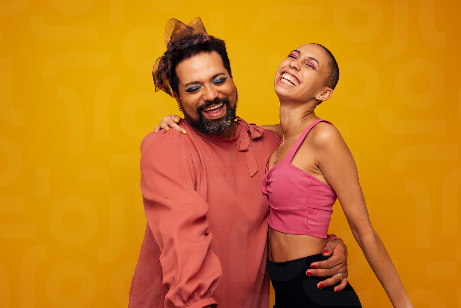 Portrait of a woman with her gay male friend on yellow background. Happt friends smiling together in studio.
