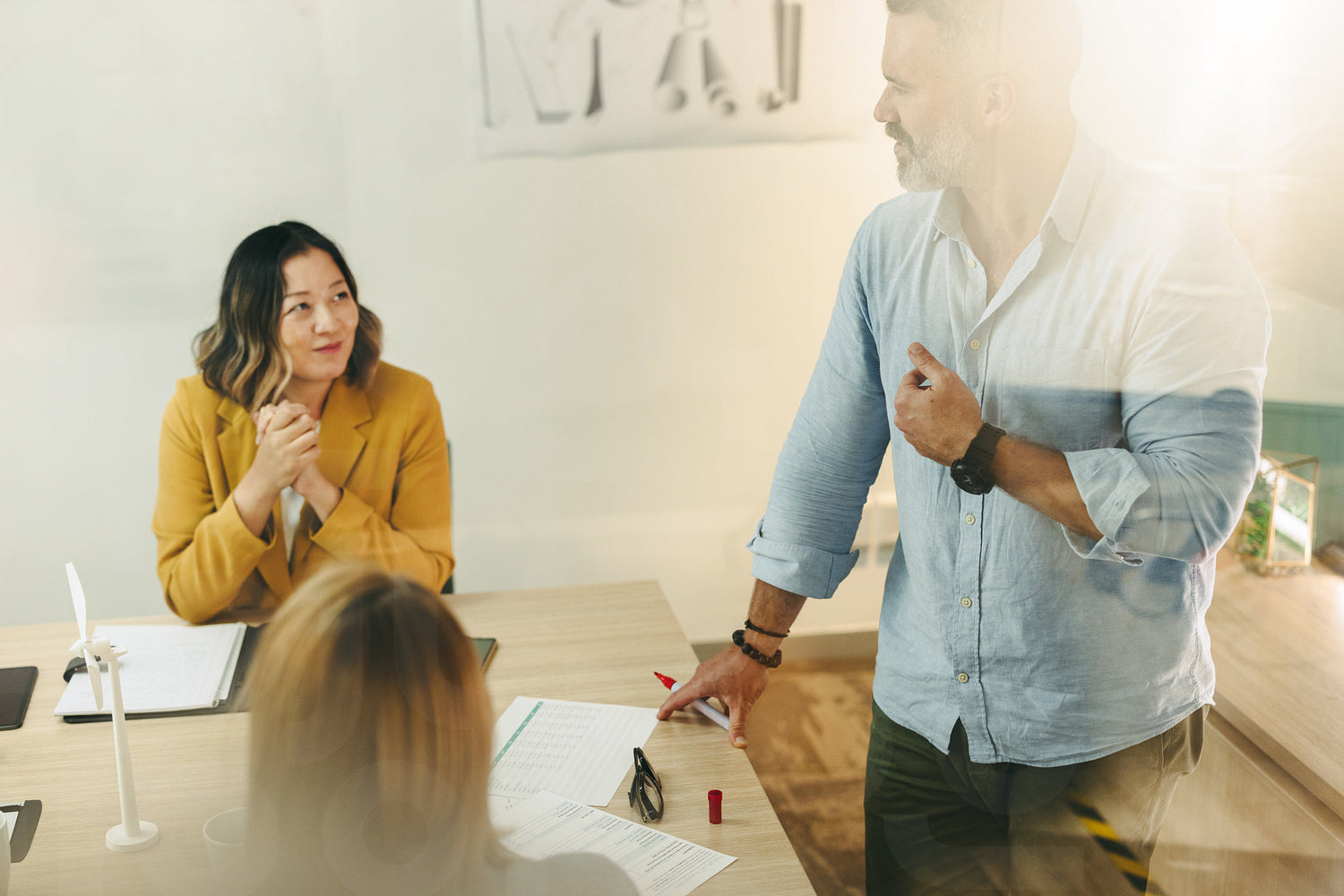 Mature mechanical engineer sharing his creative ideas during a meeting in a boardroom. Group of innovative businesspeople planning a project on renewable energy.
