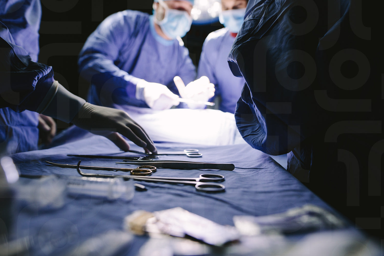 Close-up of nurse taking medical instruments for operation with colleagues doing surgery in background. Medical team performing operation in hospital.