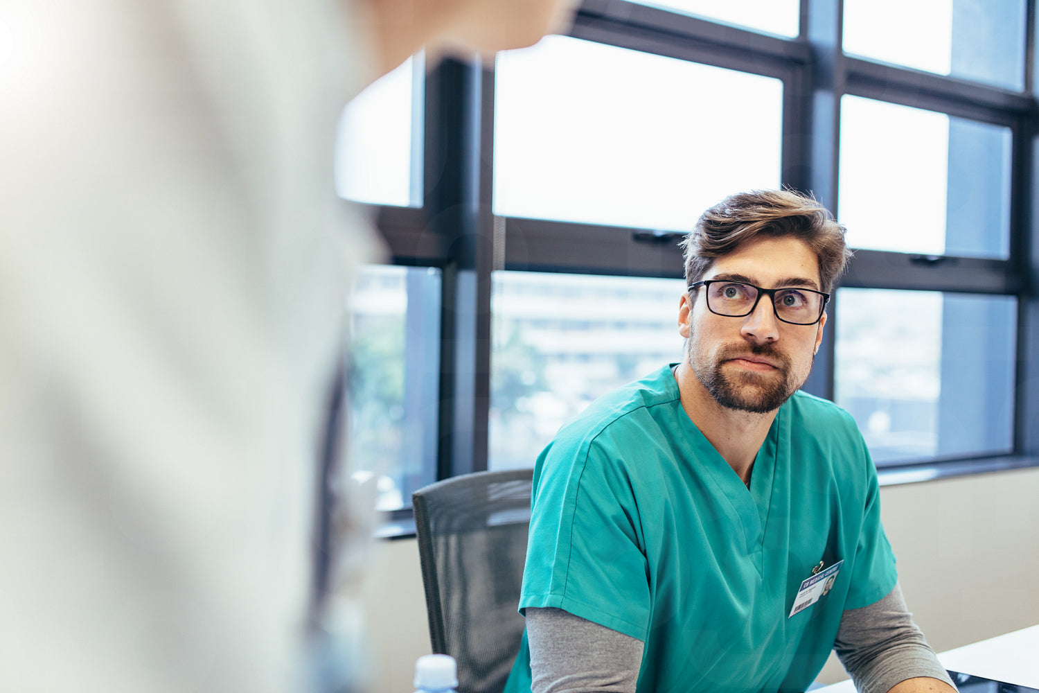 Male nurse in meeting with colleagues at boardroom. Medical professional paying attention during briefing.