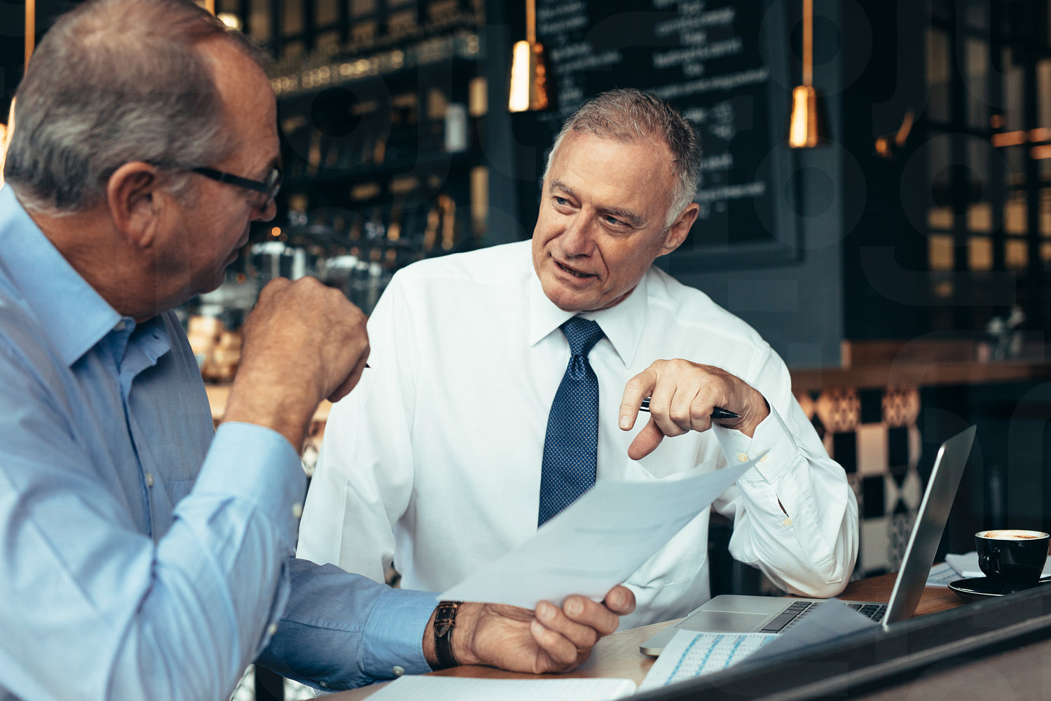 Men discussing business reports at cafe