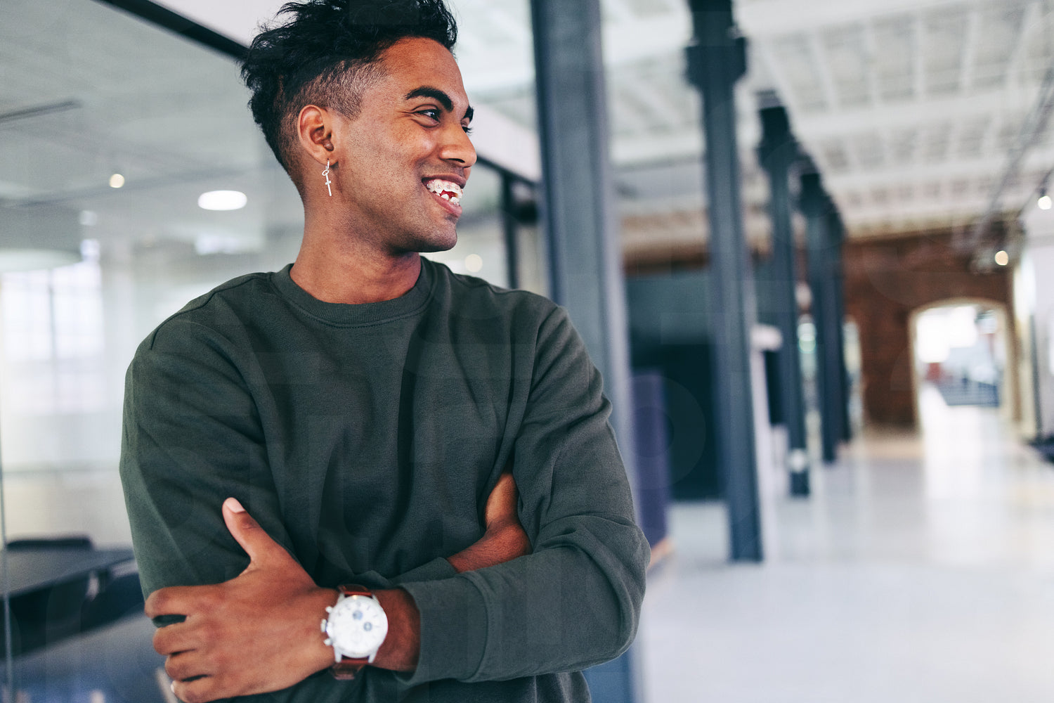 Modern businessman smiling while standing alone in a creative office. Happy young businessman looking away cheerfully while standing with his arms crossed. Businessman wearing business casual clothing.