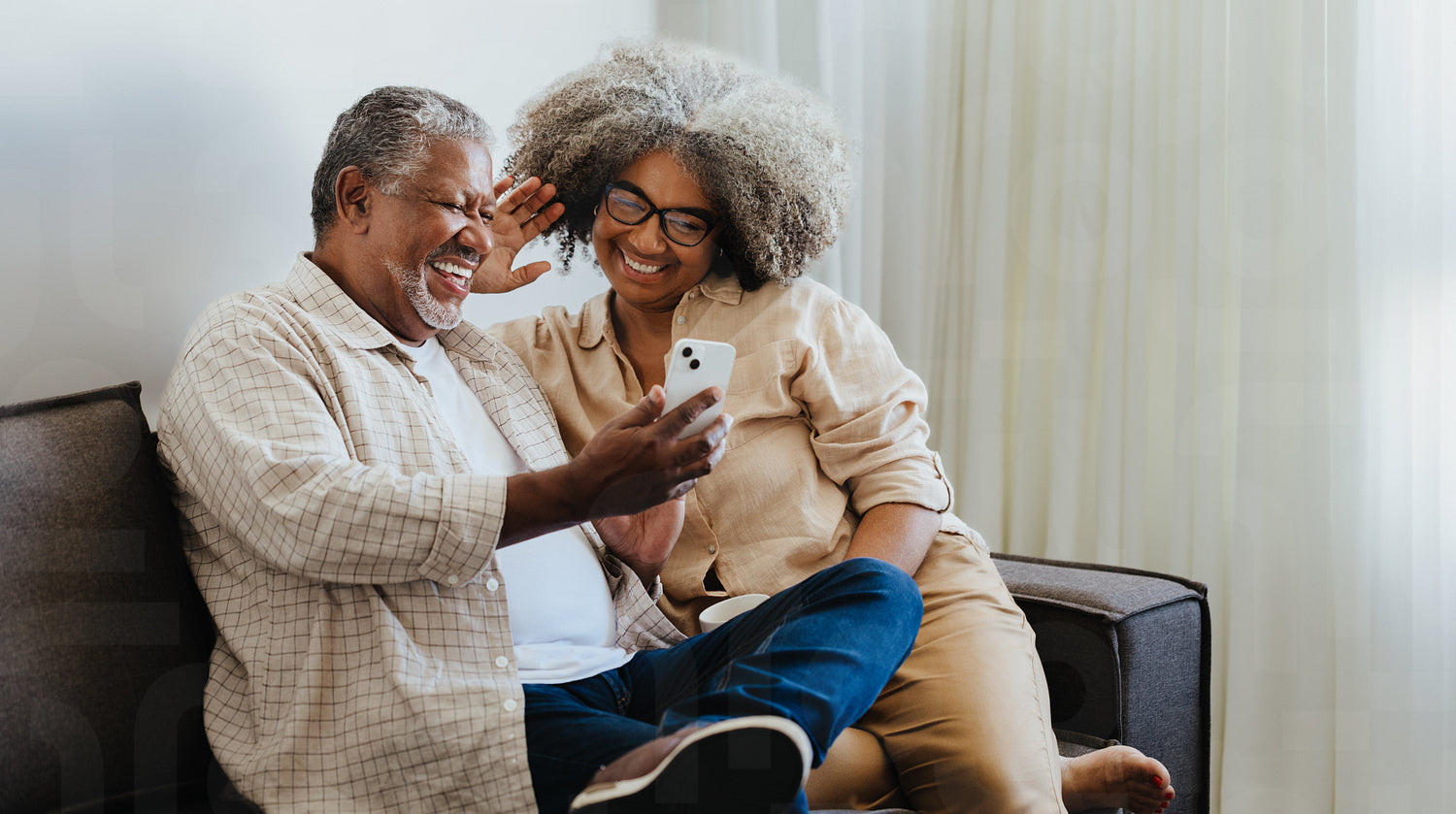 Elderly couple smiling and sharing a joyful moment while using a smartphone together on a couch at home.