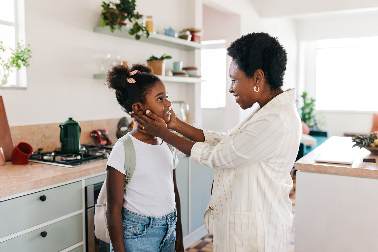 Mom and her daughter share a goodbye in the kitchen, as they both get ready for their school and work day. Woman showing parental love and affection to her during during their family morning routine.
