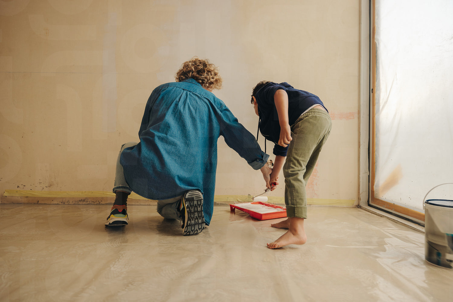 Creative, caucasian mother and her young son painting an interior wall together, renovating their home. This DIY project showcases their dedication to home improvement and their teamwork as a family.