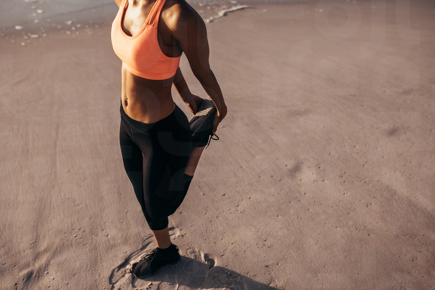 Female athlete in sports wear stretching before running on the beach. Cropped shot woman warming up.