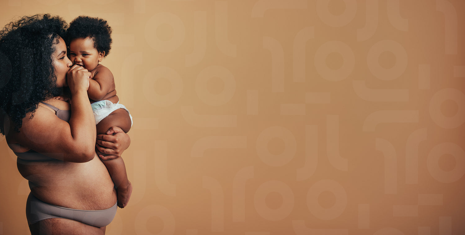 Loving mom and cute baby. Plus size female kissing hand on her baby. Real body of a healthy mother.