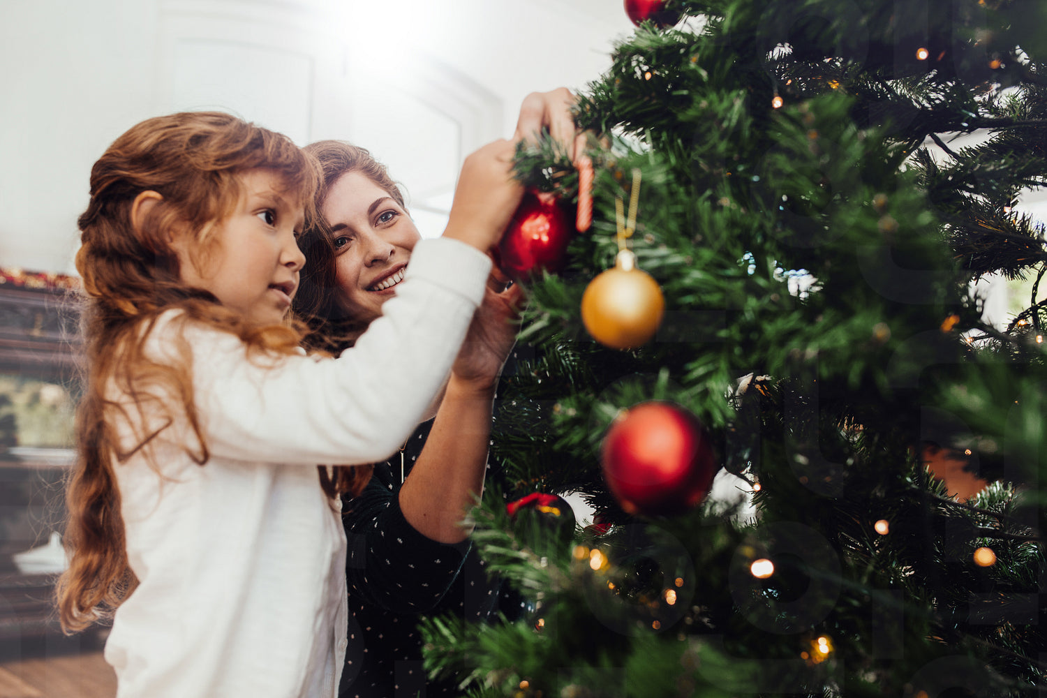 Mother and daughter decorating Christmas tree and having fun. Little girl tying shiny decorative balls on Christmas tree.