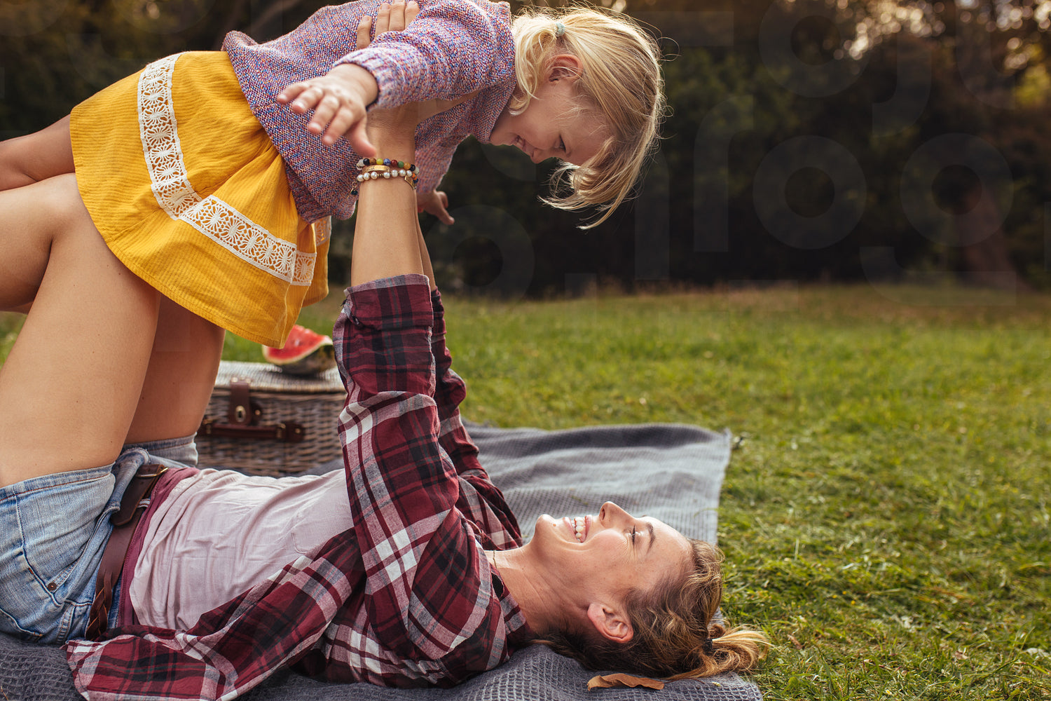 Young family enjoying a day in nature, having a picnic and spending time together. Mother lifting her daughter in garden beside a picnic basket.