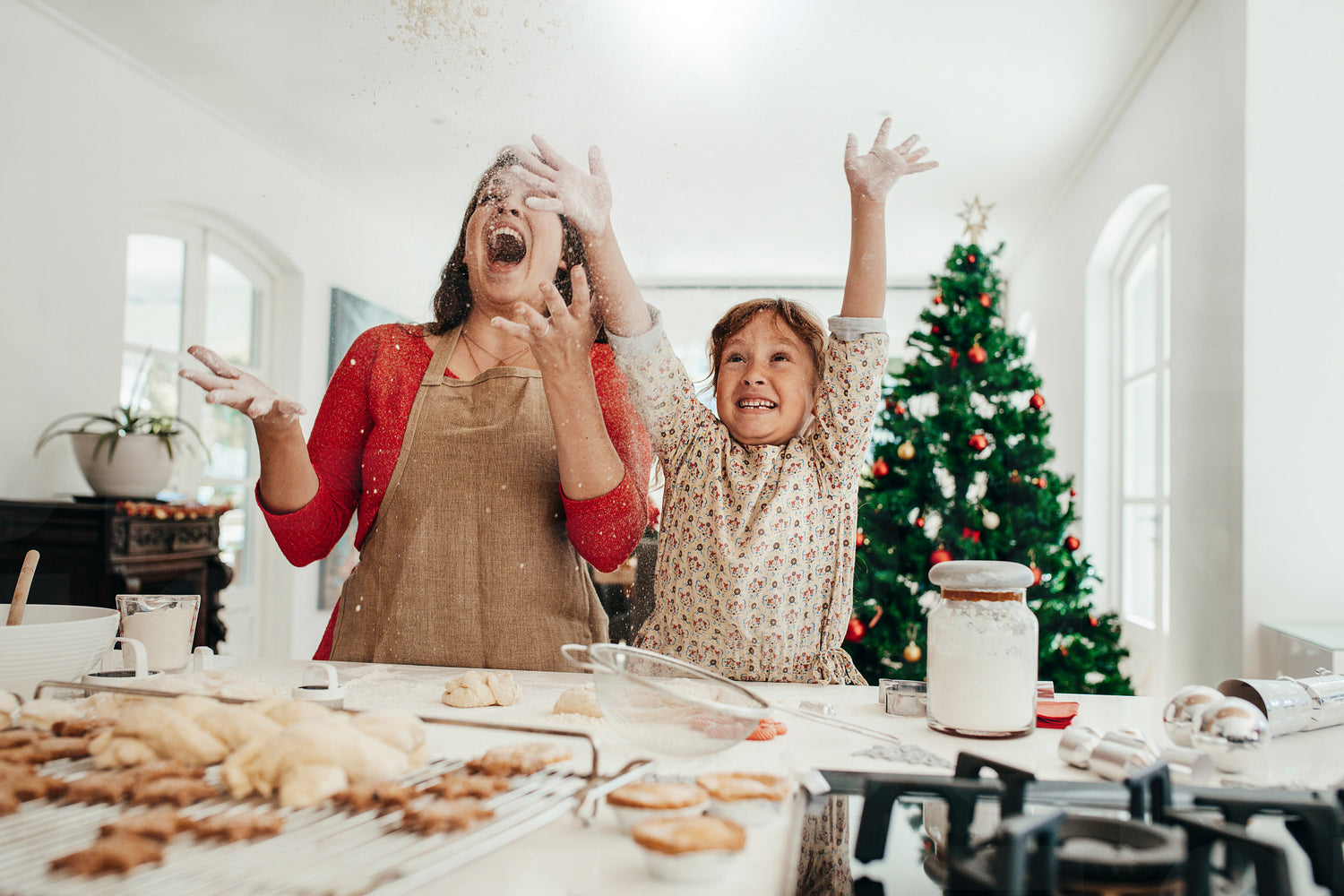 Happy mother and daughter in kitchen throwing flour in air while making cookies. Baked star cookies, muffins and gingerbread on kitchen table with decorated Christmas tree in the background.