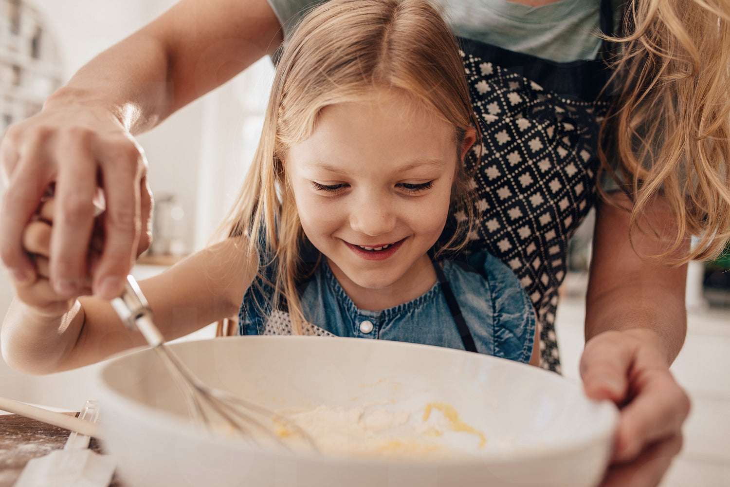 Beautiful little girl with her mother mixing batter in bowl and smiling. Mother and daughter in kitchen preparing batter for baking.