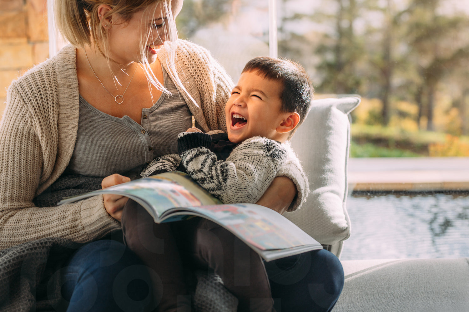 Mother and son looking each other holding a book and laughing while sitting on a couch in the living room at home. Happy young family having fun while learning.
