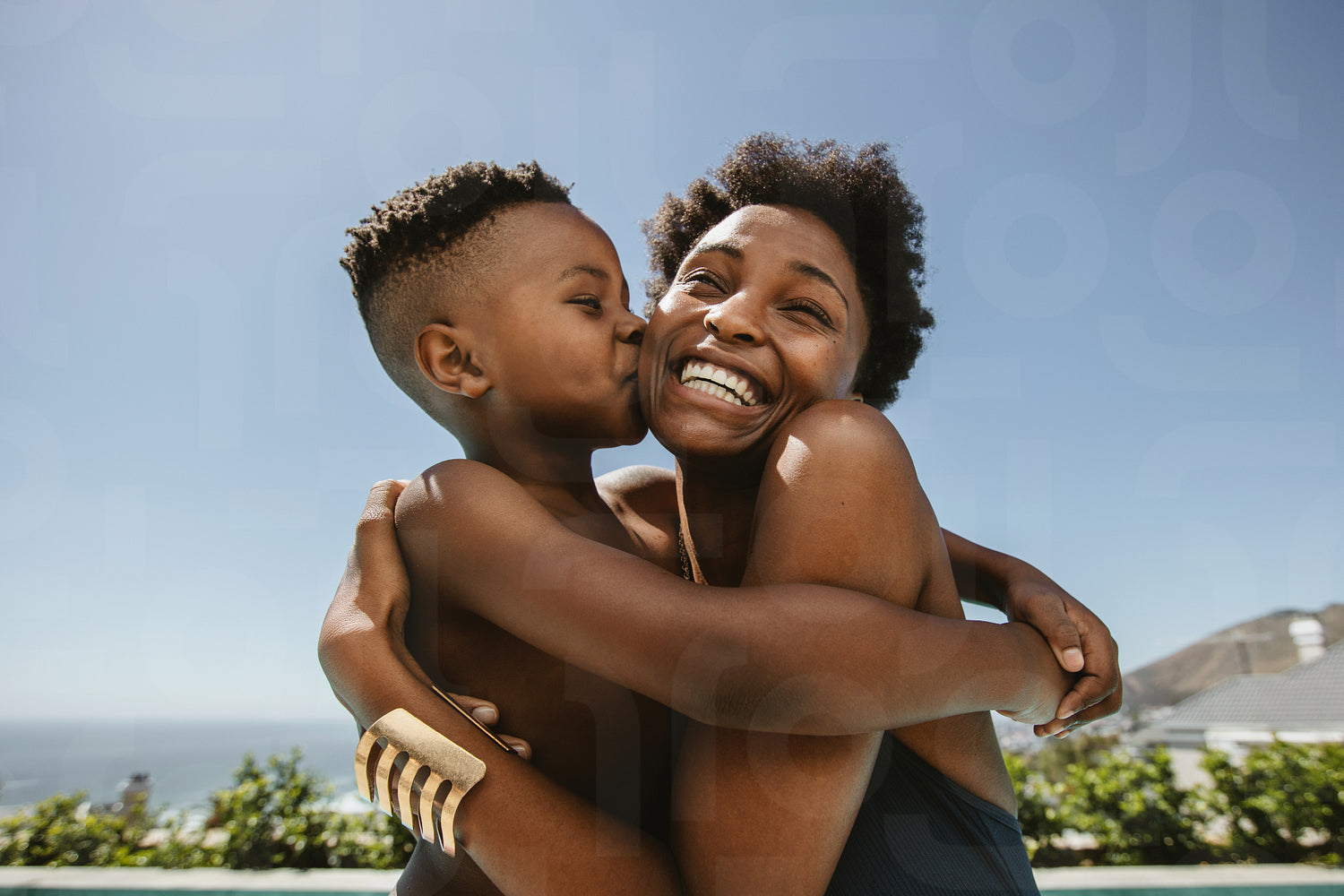 Boy kissing on cheeks of her mother. Cute boy hugging his smiling mother and kissing in her face.