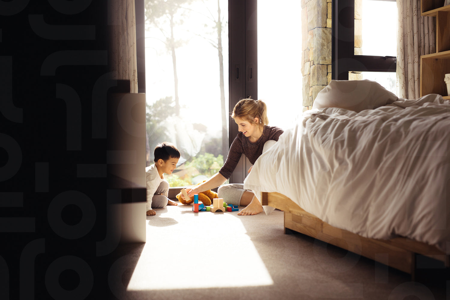 Mother and little son are playing with different developing toys in bedroom. Young woman spend fun time with her son. Mum and kid playing with wooden blocks