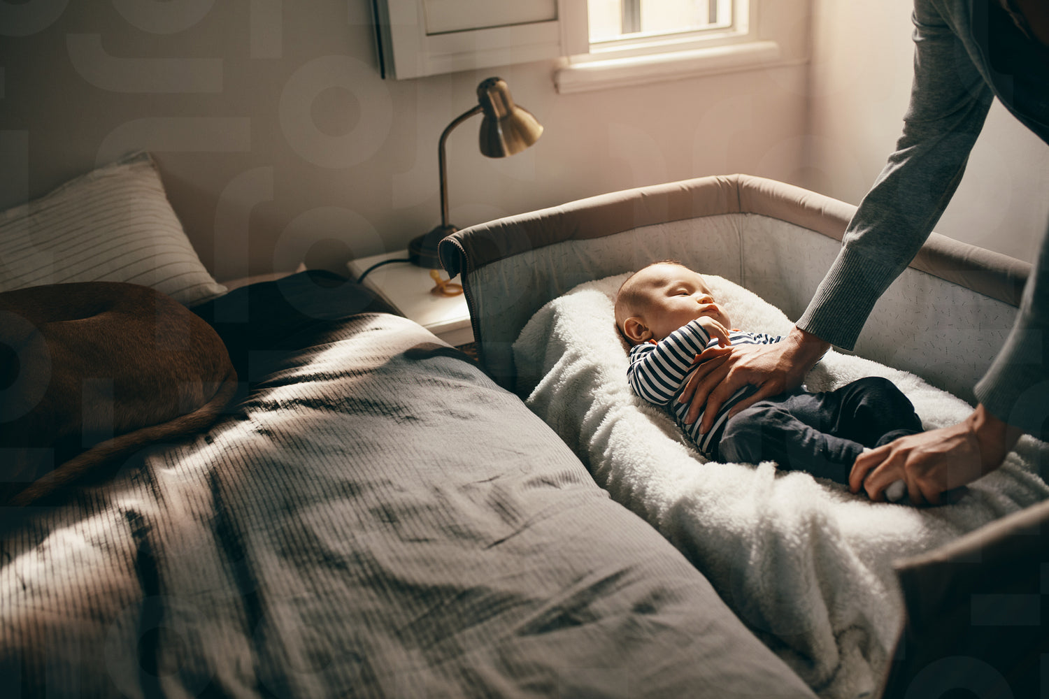 Mother putting her baby to sleep on a bedside baby crib. Woman attending to her sleeping baby and patting him.