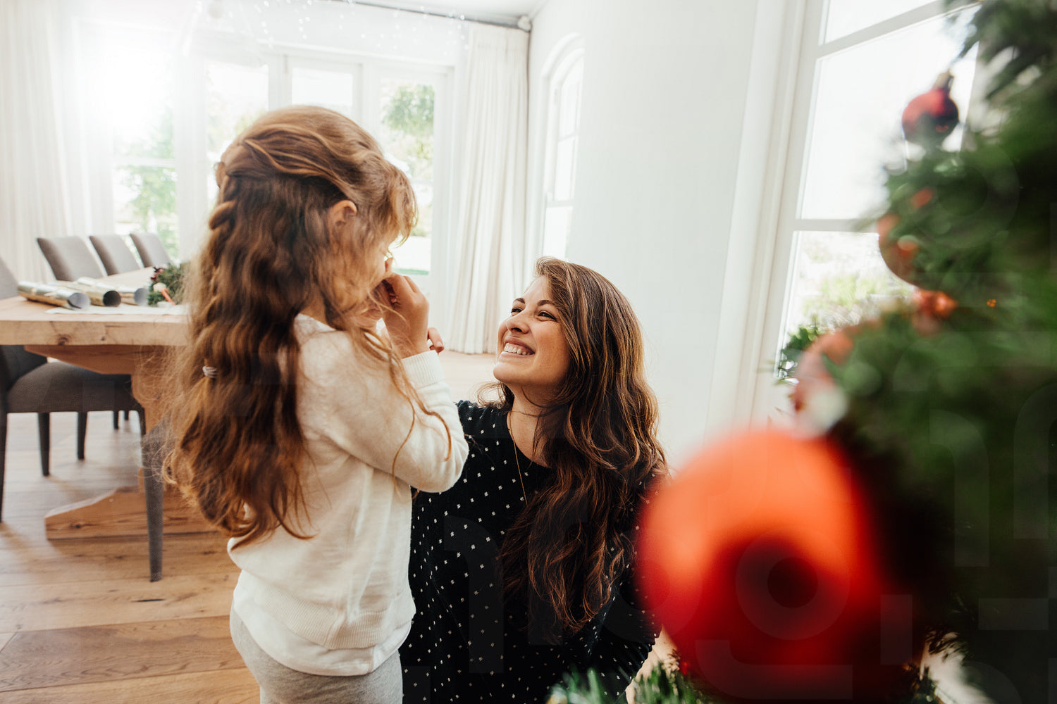 Mother and daughter celebrating Christmas. Smiling young woman with her daughter having happy time while celebrating Christmas.