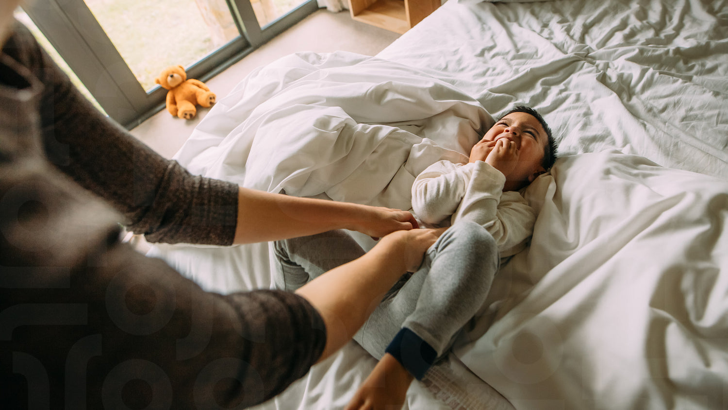 Mother tickling her boy on the bed