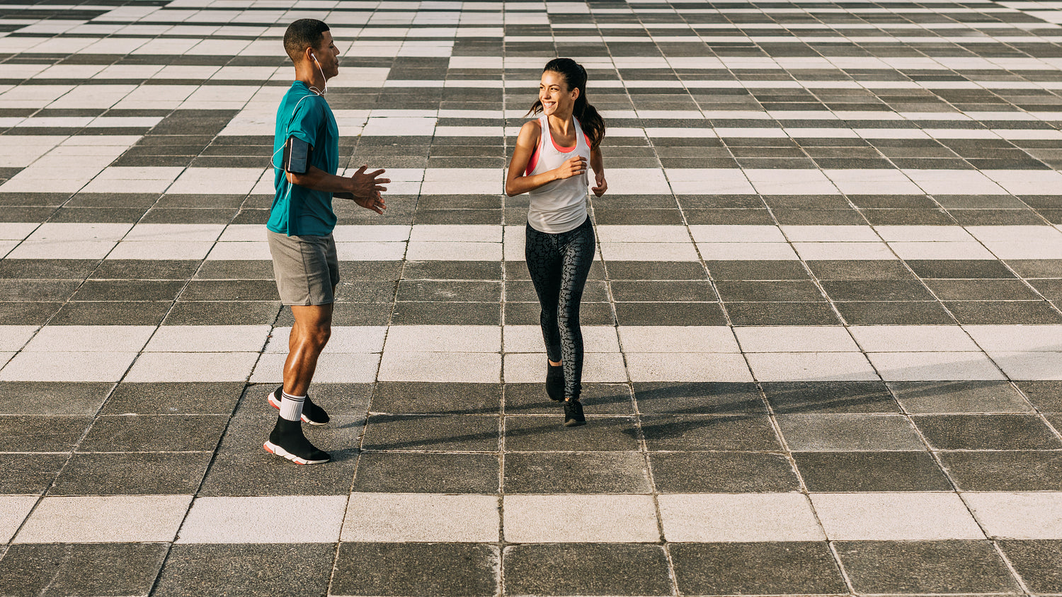 Happy man and woman running together in the city. Couple in sportswear training together in the city.