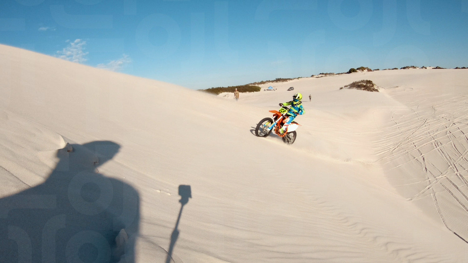 Motocross athlete creating dust while riding a dirt bike on sand dunes. Motorcyclist racing with a cross country motorbike in a desert.