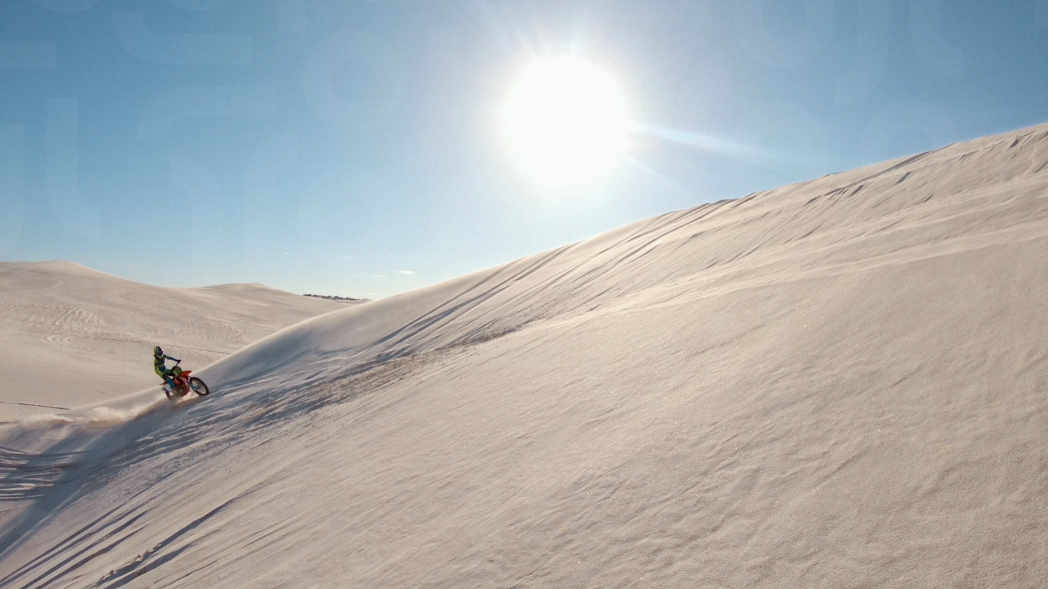 Motocross athlete creating dust while riding a dirt bike on sand dunes. Young motorcyclist racing on a cross country bike in a desert.