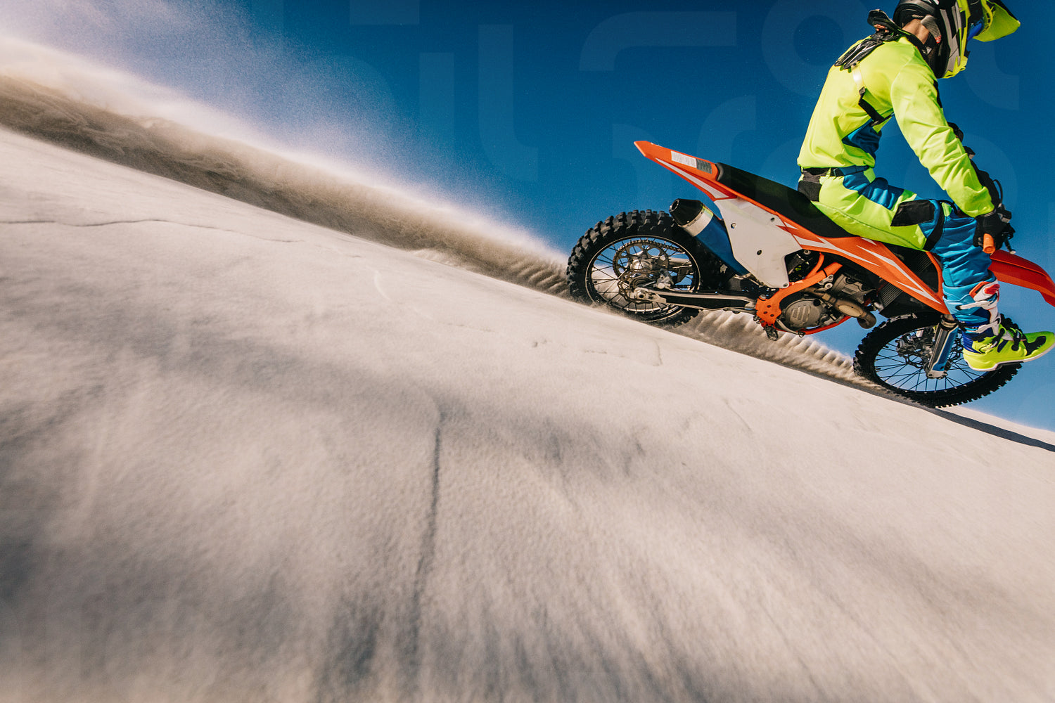 Side view of a professional motocross biker riding on his bike. Motorcycle rider in racing gear riding on sand dune leaving a trail of sand dust.