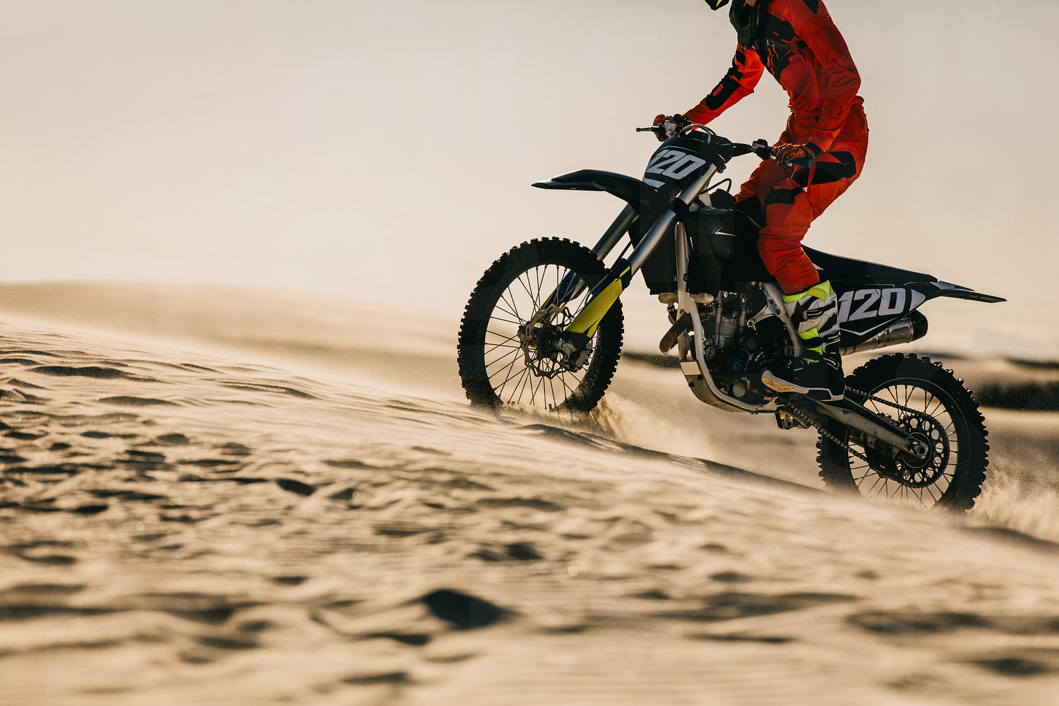 Motocross rider riding on his racing bike up the sand dune. Motorbike rider riding his bike in desert in standing position.