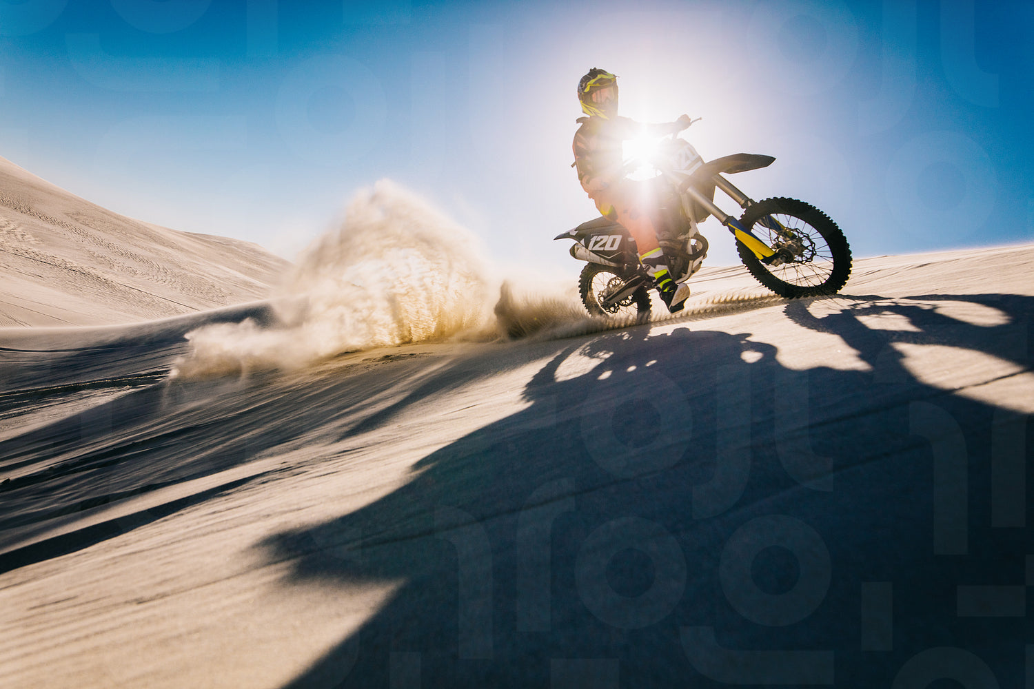 Professional motocross biker riding his bike on a sand dune with his shadow in front. Motorbike rider in racing gear riding on the sand dune leaving a trail of sand dust with sun in the background.