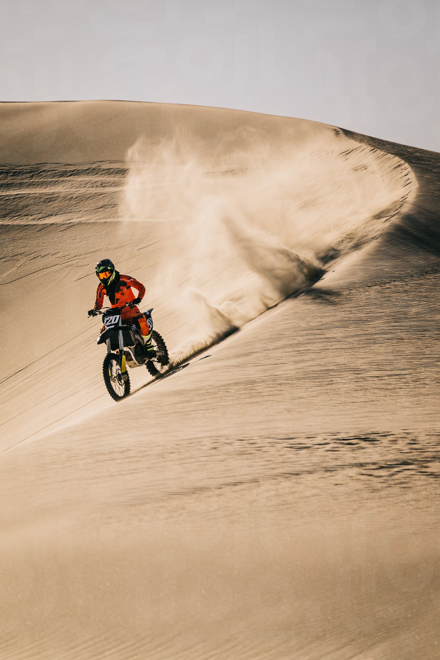 Dirt biker riding over sand dunes. Motocross racer riding motorcycle in desert with sand flying behind.