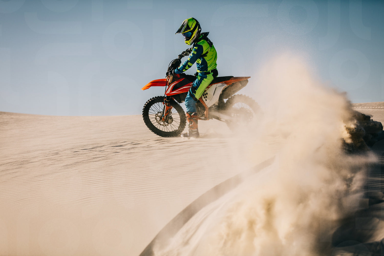 Motocross rider creates a cloud of dust and debris over sand dunes. Dirt biker speeding over sand dunes.