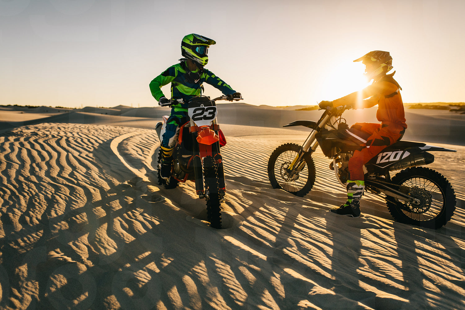 Two dirt bikers standing on the sand dune and talking between the trial run. Riders practising off roading in desert.
