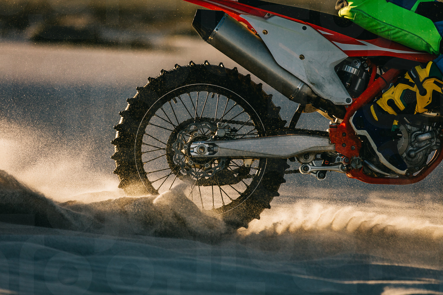 Close up of motocross wheel on sand dunes. Flying debris during an acceleration in a motocross ride.
