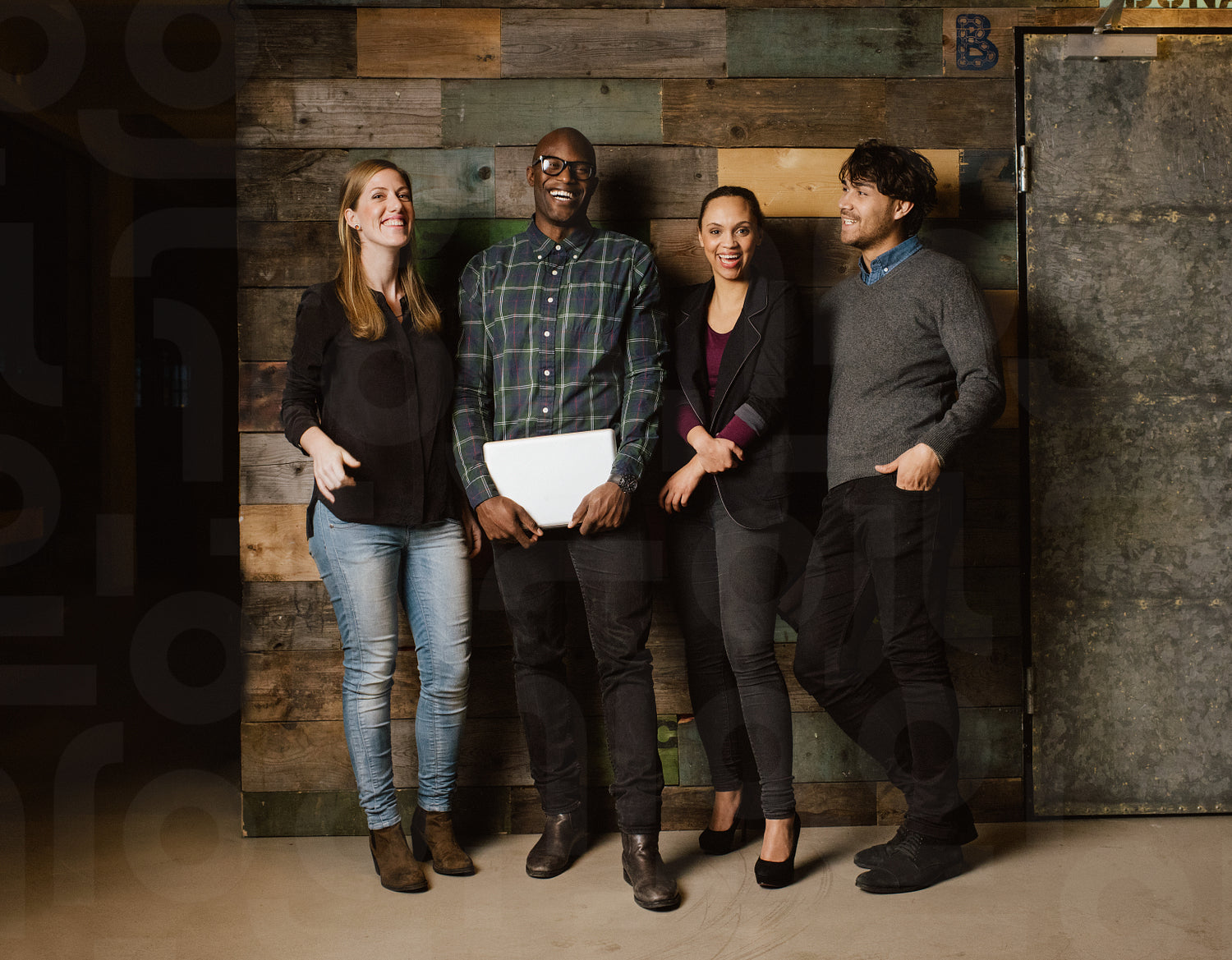 Portrait of young professionals laughing while standing together in office. Multi ethnic business team looking happy together.
