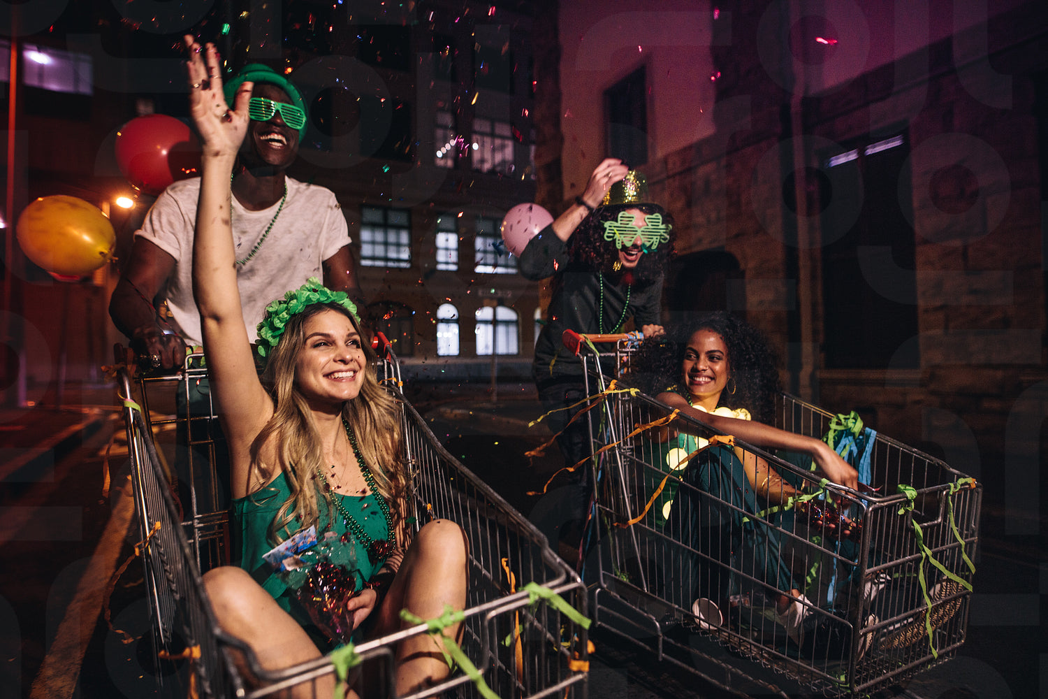 Women throwing confetti while sitting in shopping carts pushed by men. Multi-ethnic friends celebrate St.Patrick's day with confetti at night on city street.